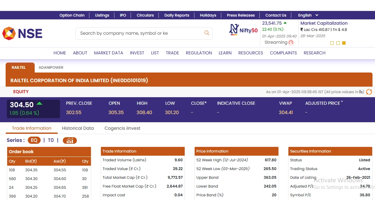 Stocks of Railtel Corporation Of India Limited (NSE: RAILTEL) opened in green today, April 1, as the stock market opened for business. According to the latest trading updates on the National Stock Exchange (NSE) website, shares of Railtel Corporation Of India Limited (NSE: RAILTEL) were trading at INR 304.50 and rose by INR 1.95 or 0.64 per cent. Railtel Corporation Of India Limited saw its 52-week high of INR 617.80 on July 12 last year. Stocks To Buy or Sell Today, April 1, 2025: HAL, Adani Green Energy, and Varun Bevarages Among Shares That May Remain in Spotlight on Tuesday.