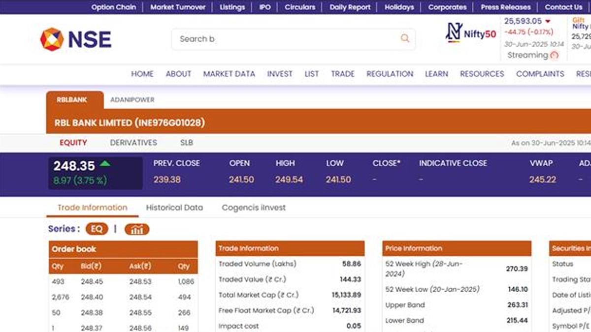 Stocks of RBL Bank Limited (NSE: RBLBANK) opened in green today, June 30, as soon as the stock market opened for business. According to the National Stock Exchange (NSE) website, shares of RBL Bank Limited (NSE: RBLBANK) were trading at INR 248.35 and rose by INR 8.97, or 3.75 per cent. RBL Bank Limited (NSE: RBLBANK) stocks saw their 52-week high of INR 270.39 on June 28 last year. Stocks To Buy or Sell Today, June 30, 2025: BHEL, HAL, Piramal Enterprises Among Shares That May Remain in Focus on Monday.