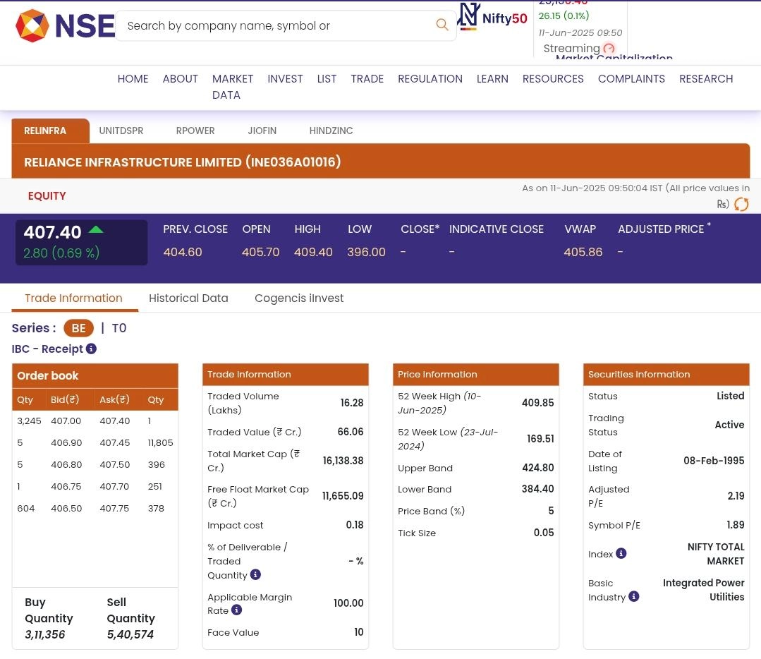 Stocks of Reliance Infrastructure Limited (NSE: RELINFRA) opened in green today, June 11, during the early morning trade. According to the National Stock Exchange (NSE) website, shares of Reliance Infrastructure Limited (NSE: RELINFRA) were trading at INR 407.40 and rose by INR 2.80 or 0.69%. United Spirits Share Price Today, June 11: Stocks of United Spirits Limited Drop by 5.18% in Early Trade As Maharashtra Hikes Excise Duties, Check Latest Price on NSE.