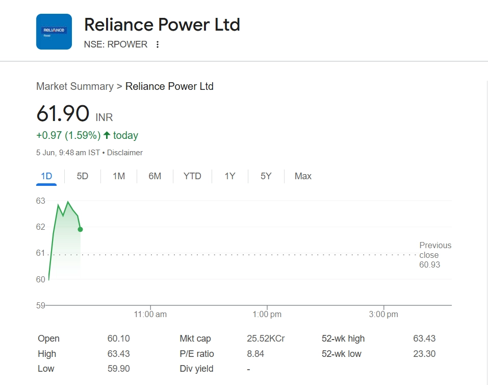 Reliance Power share price (NSE: RPower) witnessed an upward trend in Wednesday’s trading session, gaining 1.74% to reach INR 61.99 on the NSE by 9:49 am. The stock showed positive momentum amid broader market cues and investor interest. With this rise, RPower continues its recent bullish streak, inching closer to its short-term resistance level. Traders are watching closely for further breakout signals as volumes remain steady and sentiment in the power sector improves. Stocks To Buy or Sell Today, June 05, 2025: HAL, REC and YES Bank Among Shares That May Remain in Spotlight on Thursday.