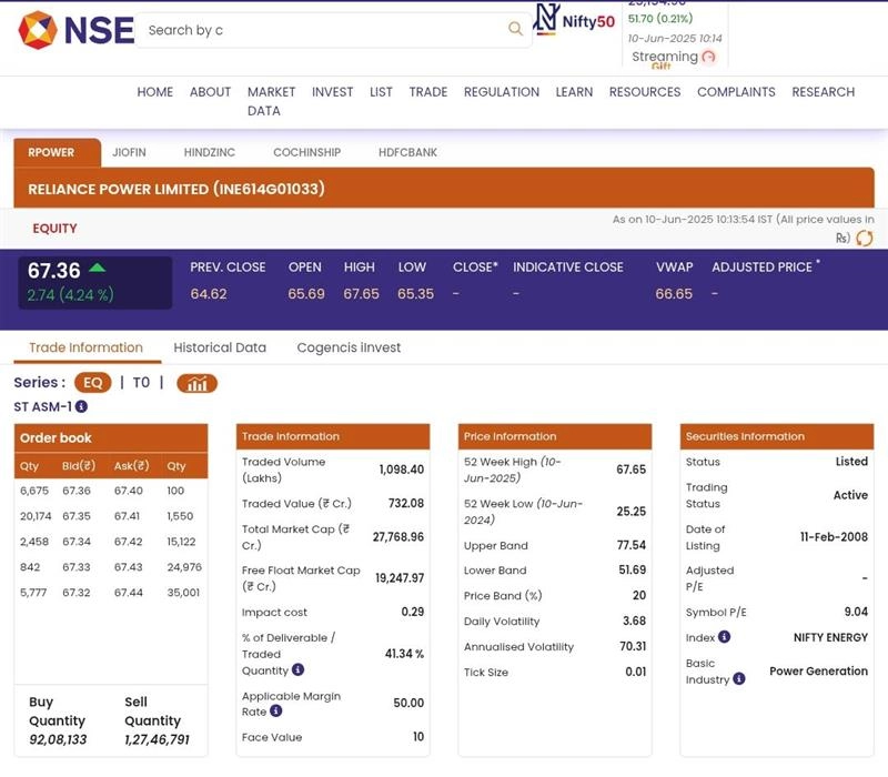Stocks of Reliance Power Limited (NSE: RPOWER) opened in green today, June 10, during the early morning trade. According to the National Stock Exchange (NSE) website, shares of Reliance Power Limited (NSE: RPOWER) were trading at INR 67.36 and rose by INR 2.74 or 4.24%. Jio Financial Services Share Price Today, June 10: Stocks of Jio Financial Services Limited Up by 0.21% in Early Trade, Check Latest Price on NSE.