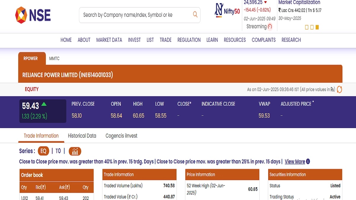 Shares of Reliance Power Limited (NSE: RPOWER) opened on a positive note today, June 2. As per the latest stock market updates, stocks of Reliance Power Limited (NSE: RPOWER) were trading at INR 59.43 and rose by INR 1.33 or 2.29 per cent. Notably, Reliance Power Limited (NSE: RPOWER) saw its 52-week high of INR 60.65 today and 52-week low of INR 23.30 on June 5 last year. MMTC Share Price Today, June 2: Stocks of MMTC Limited Fall by 6.03% in Early Trade, Check Latest Price on NSE.