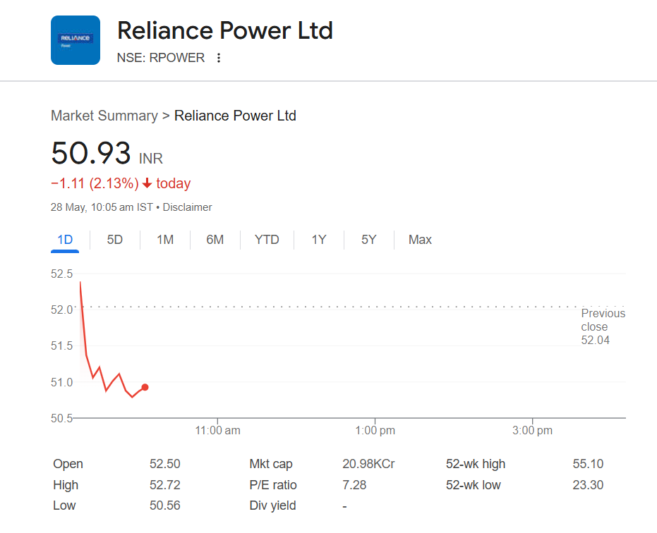 Reliance Power share price (NSE: RPower) dropped 2.13% to INR 50.93 in morning trade on May 28, reflecting weak market sentiment and profit-booking after recent gains. The stock, which had seen a strong rally in previous sessions, faced selling pressure as investors turned cautious. Broader market volatility and lack of fresh positive triggers contributed to the decline. Analysts suggest the stock may see consolidation in the near term amid sector-specific uncertainties. Stocks To Buy or Sell Today, May 28, 2025: LIC, Bosch India and Waaree Energies Among Shares That May Remain in Focus on Wednesday.