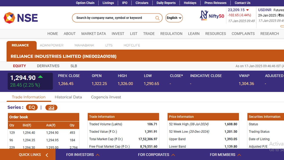The shares of Reliance Industries Limited (NSE: Reliance) opened in green today, January 17, in early trade. According to the National Stock Exchange, Reliance Industries Limited (NSE: Reliance) was trading at INR 1,294.90 and saw a rise of INR 28.45 or 2.25 per cent. Reliance Industries Limited (NSE: Reliance) stock saw its 52-week high of INR 1,608.80 on July 8 last year and a 52-week low of INR 1,201.50 on December 20 last year. Stocks To Buy or Sell Today, January 17, 2025: Reliance Industries, Infosys, Axis Bank Among Shares That May Remain in Focus on Friday.