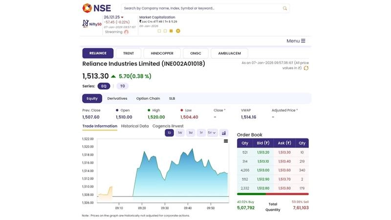 Shares of Reliance Limited (NSE: RELIANCE) opened in green in early trade on Wednesday, January 7. The stocks of Reliance Industries Limited rose by 0.38% in early trade on January 7. The RIL shares hiked by INR 5.70 and were trading at INR 1,513.30 on January 7. Stocks to Buy or Sell Today, January 7, 2026: Titan Company, Meesho and Lodha Developers Among Shares That May Remain in Focus on Wednesday.