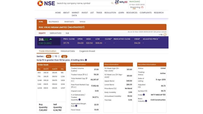 Shares of Rail Vikas Nigam Limited (RVNL) (NSE: RVNL) rose by0.28% in early trade on Wednesday, November 12. The RVNL (NSE: RVNL) shares were trading at INR 318.65 on November 12. RVNL reported a 19.7% year-on-year decline in net profit to INR 230.3 crore for Q2, despite revenue rising 5.5% to INR 5,123 crore. Stock Market Today: Sensex, Nifty Open in Green Over US-India Trade Talks, Bihar Exit Polls.