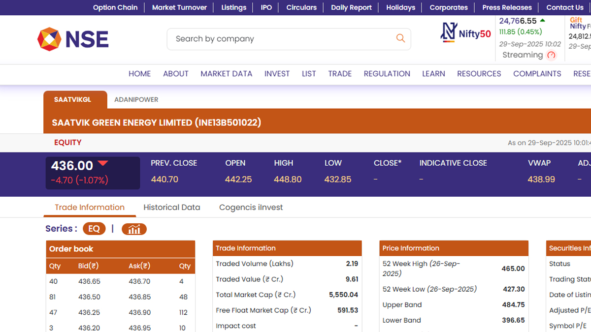 Shares of Saatvik Green Energy Limited (NSE: SAATVIKGL) opened on a negative note today, September 2, after the Indian stock market opened for business. According to the National Stock Exchange (NSE) website, stocks of Saatvik Green Energy Limited (NSE: SAATVIKGL) were trading at INR 436 and fell by INR 4.70 or 1.07 per cent. Saatvik Green Energy Limited (NSE: SAATVIKGL) stocks saw their 52-week high of INR 465 on September 26 this year and low of INR 427.30 on the same day. Adani Power Share Price Today, September 29: Stocks of Adani Power Limited Open in Green in Early Trade, Check Latest Price on NSE.