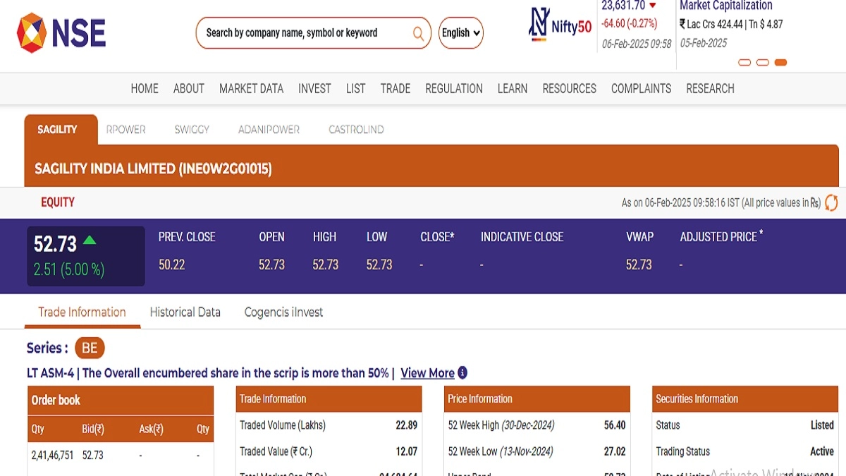Stocks of Sagility India Limited (NSE: Sagility) opened in green today, February 6. As per the latest trading updates, Sagility India Limited (NSE: Sagility) was trading at INR 52.73 and rose by INR 2.51 or 5.00 per cent. Sagility India Limited (NSE: Sagility) saw its 52-week high of INR 56.40 on December 30 last year. It also saw its 52-week low of INR 27.02 on November 13, 2024. Swiggy Share Price Today, February 6: Stocks of Swiggy Limited Fall INR 15.45 in Early Trade, Check Latest Price on NSE.