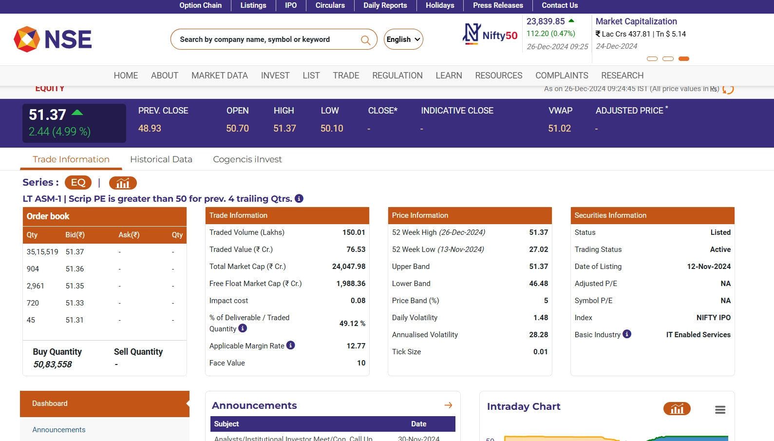 Sagility India Limited’s share price (NSE: Sagility) surged 5% on December 26, 2024, reaching INR 51.35 on the NSE and BSE. Opening at INR 50.70, the stock exhibited volatility, with a low of INR 50.09 during the day. The shares have rebounded impressively, climbing over 81% from a 52-week low of INR 27.02 in November. Market analysts remain optimistic, projecting target prices between INR 55 and INR 65 over the next year, signaling strong investor confidence in Sagility’s continued growth and recovery. Stocks To Buy or Sell Today, December 26: Apollo Tyres and Jubilant FoodWorks Among Shares That May Remain in Focus on Thursday, Know Which Stocks to Buy or Sell on December 26.