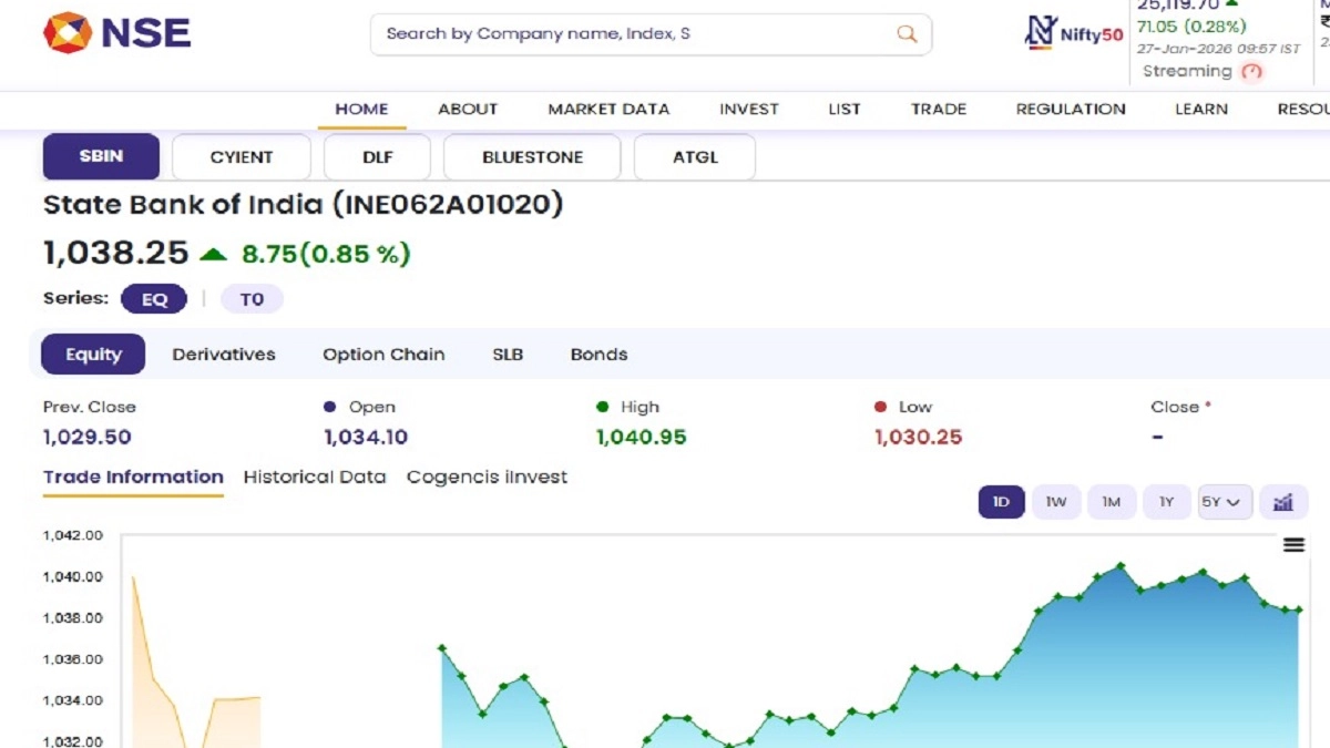 Stocks of the State Bank of India (NSE: SBIN) opened in the green today, January 27, as soon as the stock market opened for business. According to the National Stock Exchange (NSE) website, shares of State Bank of India (NSE: SBIN) were trading at INR 1,038.25 and rose by INR 8.75 or 0.85 per cent. Notably, stocks of State Bank of India (NSE: SBIN) saw their 52-week high of INR 1,055.50 on January 22 this year and 52-week low of INR 680 on March 3 last year. Stocks to Buy or Sell Today, January 27, 2026: Axis Bank, Vodafone Idea and Adani Enterprises Among Shares That May Remain in Spotlight on Tuesday.