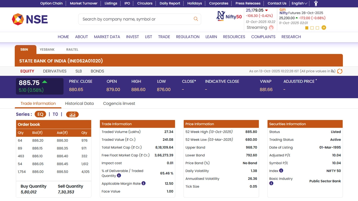 Shares of State Bank of India (NSE: SBIN) opened at INR 879.00 on Monday, October 13, against the previous close of INR 880.65, and climbed 0.58% to INR 885.75 by 10:25 AM. The stock touched a fresh 52-week high at INR 885.80 in early trade, reflecting strong demand for public sector bank shares. The surge follows a rally in the Nifty PSU Bank index, which hit a 52-week high of 7,719.95 on Friday, October 10, up 2% intra-day. SBI shares have been leading gains among PSBs, inching toward their all-time high of INR 912.10 recorded on June 6, 2024. Other PSU banks, including PNB and Indian Bank, also hit 52-week highs amid the positive trend. Since September, the Nifty PSU Bank index has surged 14%, highlighting robust sectoral momentum. Yes Bank Share Price Today, October 13: Yes Bank Stock Climbs 0.21% in Early Trade Ahead of Board Meeting Scheduled for Q2 FY26 Results; Check Latest Price on NSE.