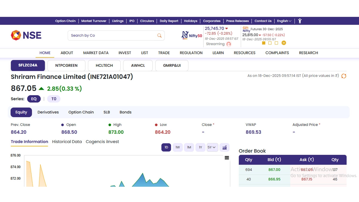 Stocks of Shriram Finance Limited (NSE: SFLZC24A) opened in the green today, December 18, as soon as the stock market opened for business. According to the National Stock Exchange (NSE) website, shares of Stocks of Shriram Finance Limited (NSE: SFLZC24A) were trading at INR 867.05 and rose by INR 2.85 or 0.33 per cent. Notably, Shriram Finance Limited (NSE: SFLZC24A) stocks saw their 52-week high of INR 875.45 on December 17 this year, and 52-week low of INR 493.35 on January 20, 2025. Stocks to Buy or Sell Today, December 18, 2025: KPI Green Energy, HCLTech and One MobiKwik Systems Among Shares That May Remain in Focus on Thursday.