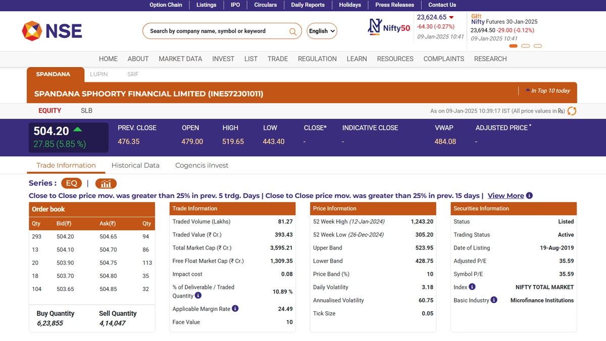 Shares of Spandana Sphoorty Financial Limited (NSE: SPANDANA) opened at INR 479.00 on Thursday, January 9, showing a slight increase from its previous close of INR 476.35. This marks the third consecutive day of gains for the company, following a 15 per cent jump on January 8. During early trade, the stock surged further to INR 504.20, up by 27.85 points (5.85 per cent). The continued upward movement has drawn investor attention, reflecting positive sentiment around the company's performance and market outlook. Lupin Share Price Today, January 9: Lupin Shares Rise 1.4% After US FDA Approval for Pithampur Facility.