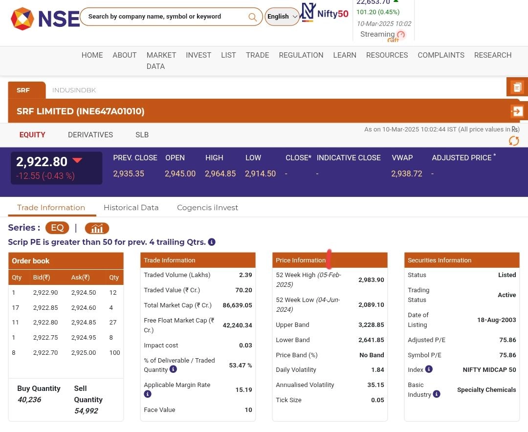 Stocks of SRF Limited (NSE: SRF) opened in red today, March 10, during the early morning trade. According to the National Stock Exchange (NSE) website, shares of SRF Limited (NSE: SRF) were trading at INR 2,922.80 and dropped by INR 12.55 or 0.43%. Stocks To Buy or Sell Today, March 10, 2025: IREDA, IndusInd Bank, Tata Power and Lupin Among Shares That May Remain in Spotlight on Monday.