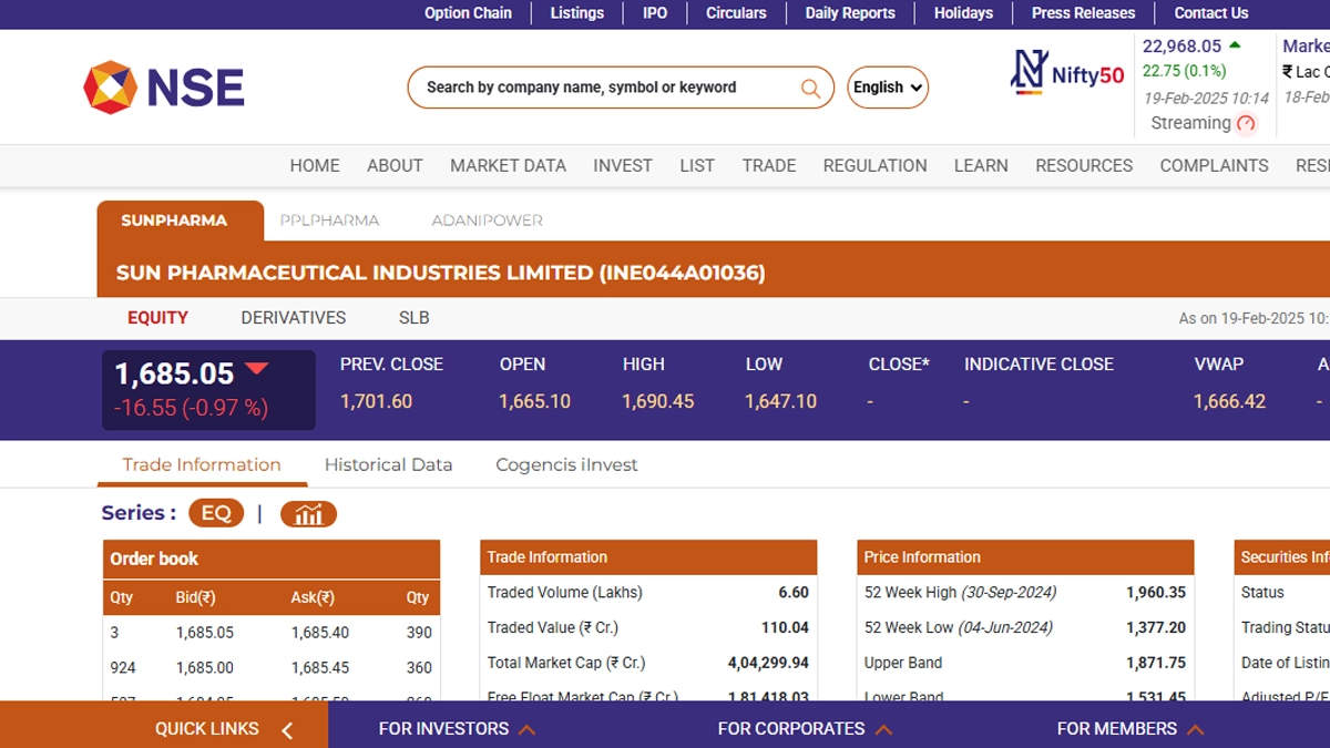 Shares of Sun Pharmaceutical Industries Limited (NSE: Sun Pharma) opened on a negative note today, February 19. Stocks of Sun Pharmaceutical Industries Limited (NSE: Sun Pharma) were trading at INR 1,685.05 and fell by INR 16.55 or 0.97 per cent. Sun Pharmaceutical Industries Limited (NSE: Sun Pharma) stocks saw their 52-week high and low of INR 1,960.35 and INR 1,377.20 on September 30 and June 4, 2024, respectively. Piramal Pharma Share Price Today, February 19: Stocks of Piramal Pharma Limited Open in Green in Early Trade, Check Latest Price on NSE.