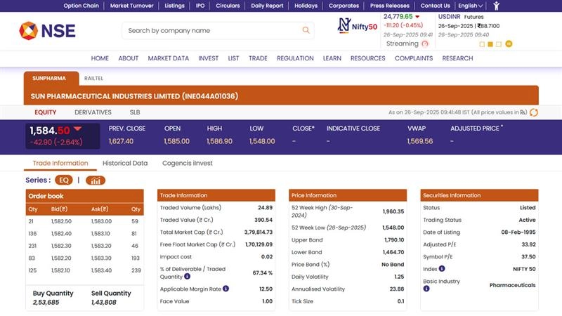 Shares of Sun Pharmaceutical Industries Ltd (NSE: SUNPHARMA) fell sharply on Friday, September 26, after the US announced a 100% tariff on branded and patented drug imports starting October 1. The stock opened at INR 1,585 against its previous close of INR 1,627.40, and by 9:45 AM, it was trading at INR 1,584.50, down 2.64% in early trade. The tariff announcement impacted Sun Pharma’s key speciality products, including Illumya, Cequa, Odomzo, and Winlevi, which account for 19.3% of the company’s overall sales. The tariffs will not apply to companies with existing or under-construction US plants, providing limited relief for some exporters. The company’s 52-week high stands at INR 1,960.35, while the 52-week low is INR 1,548.00, reflecting recent market volatility. Stocks to Buy or Sell Today, September 26, 2025: Indraprastha Gas, Tata Steel, Jio Financial Among Shares That May Remain in Focus on Friday.