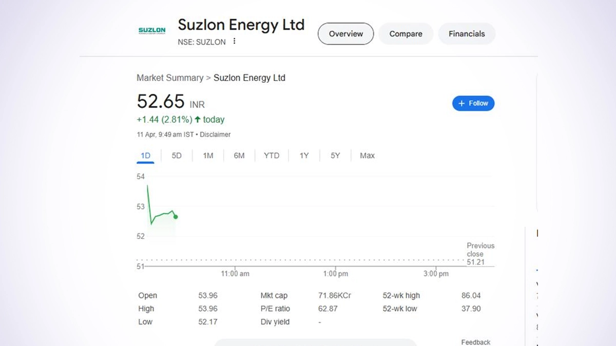 Suzlon Energy Ltd (NSE: Suzlon) witnessed a modest gain of 2.81% in early trading hours on April 11, with its share price rising to INR 52.65. The stock opened slightly higher at INR 53.96 and remained volatile, touching an intraday low of INR 52.17. With a market capitalization of INR 71,860 crore and a high price-to-earnings (P/E) ratio of 62.87, Suzlon continues to attract investor interest despite recent fluctuations. Muthoot Finance Share Price Today, April 11: MuthootFin Falls Over 6% to INR 2,009 in Early Trade, Check Latest Price on NSE.