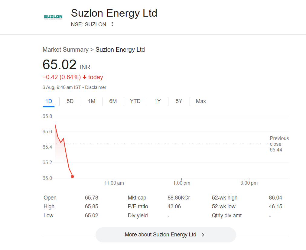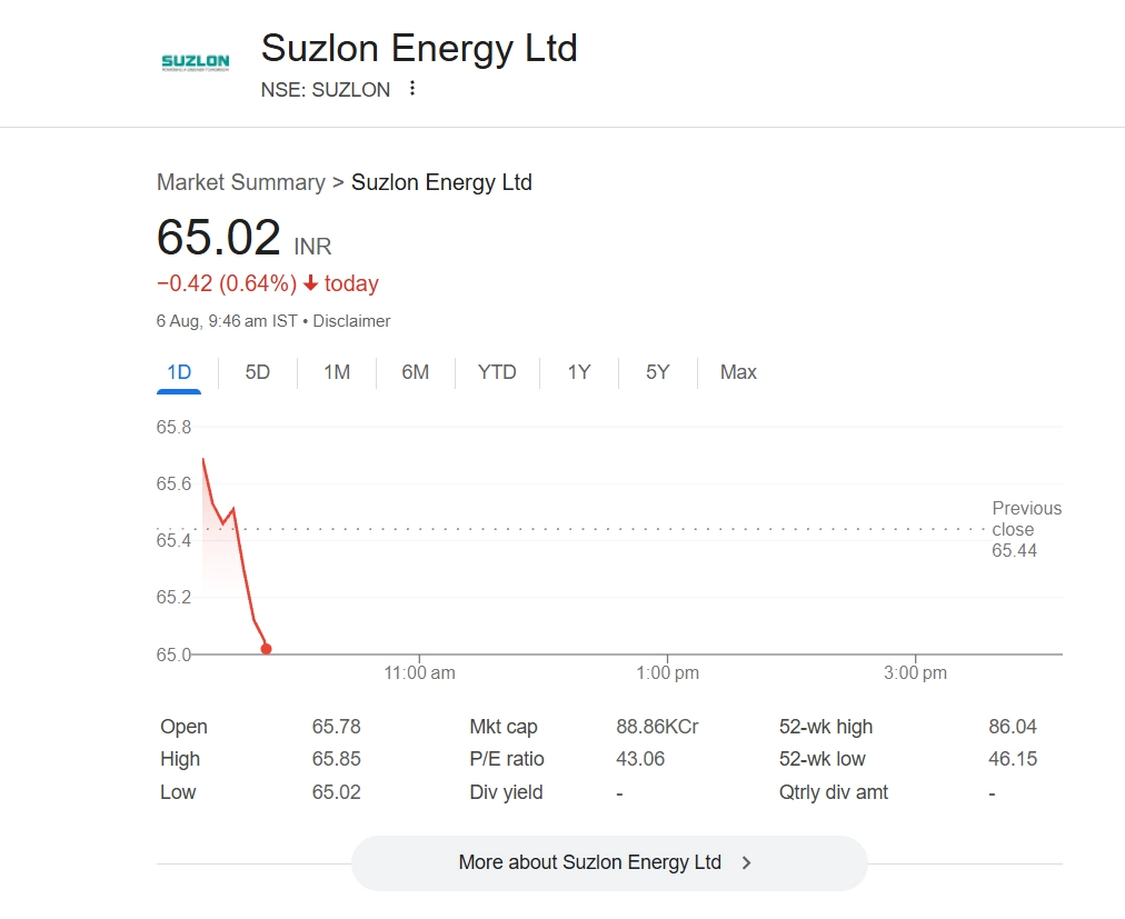 Suzlon Energy Share Price (NSE: SUZLON) opened weaker on Tuesday, August 6, trading at INR 65.02, down by INR 0.42 or 0.64% as of 9:46 AM IST. The marginal dip comes amid a cautious tone in broader markets, even as the renewable energy sector remains upbeat on long-term growth prospects. Investors are closely watching Suzlon’s order book strength and operational efficiency. The stock had recently seen a rally driven by rising demand for green energy and strong quarterly performance. Analysts advise keeping an eye on short-term consolidation in the stock. Stocks to Buy or Sell Today, August 06, 2025: Bharti Airtel, Prestige Estates, Lupin Ltd Among Shares That May Remain in Focus on Wednesday.