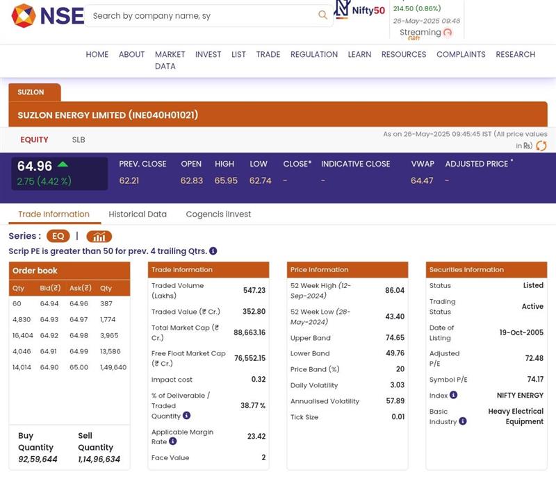 Suzlon Energy Limited (NSE: SUZLON) stocks opened in the green today, May 26, soon after the Indian stock market opened for trading. According to the National Stock Exchange (NSE), shares of Suzlon Energy (NSE: SUZLON) were trading at INR 64.96 and rose by INR 2.75 or 4.42 per cent. Stocks To Buy or Sell Today, May 26, 2025: JSW Steel, Union Bank of India, NTPC Among Shares That May Remain in Focus on Monday.