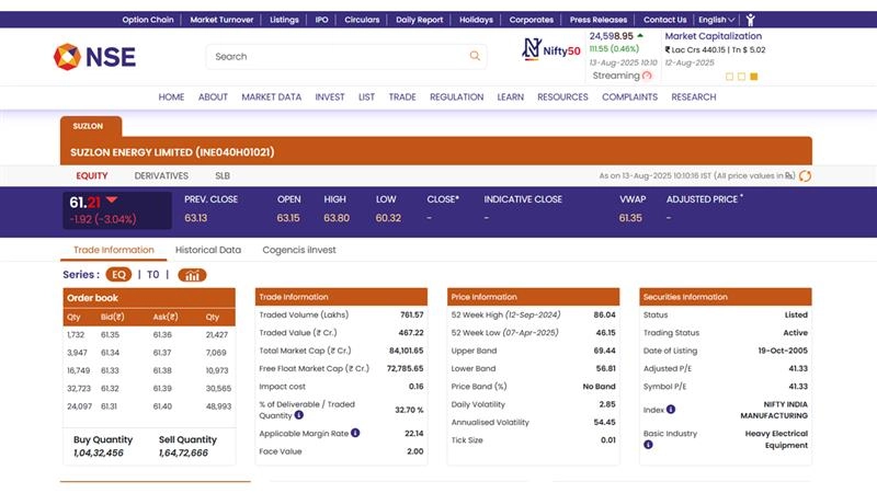 Shares of Suzlon Energy Ltd (NSE: SUZLON) fell over 3% in early trade on Wednesday, August 13, despite the company reporting a 7.3% year-on-year rise in Q1 FY26 profit. The stock opened at INR 63.15 against its previous close of INR 63.13 and was trading at INR 61.21 by 10:10 AM, down by 3.04%. Suzlon posted a consolidated net profit of INR 324.32 crore for the June quarter, compared to INR 302.21 crore a year ago. Total income rose sharply to INR 3,165.19 crore from INR 2,044.35 crore, while EBITDA jumped to INR 599 crore from INR 370 crore. Suzlon’s stock remains well below its 52-week high of IN;R 86.04 but above its 52-week low of INR 46.15. Stocks To Buy or Sell Today, August 13, 2025: Apollo Hospitals, Suzlon Energy and Jindal Steel Among Shares That May Remain in Spotlight on Wednesday.