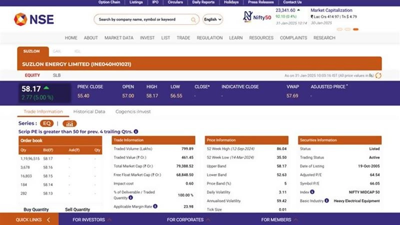 Shares of Suzlon Energy Ltd (NSE: SUZLON) surged 5 per cent on January 31, trading at INR 58.17 after opening at INR 57, recovering from the previous session’s decline. The stock had closed at INR 55.40 in the last session, marking a drop from its opening price of INR 55.39. Despite recent volatility, Suzlon’s market capitalization stands at INR 75,610.01 crore. Over the past year, the stock has ranged between a high of INR 86.04 and a low of INR 35.49. GAIL Share Price Today, January 31: GAIL Shares Surge 3.67% As Q3 Net Profit Rises 28% to INR 4,084 Crore.