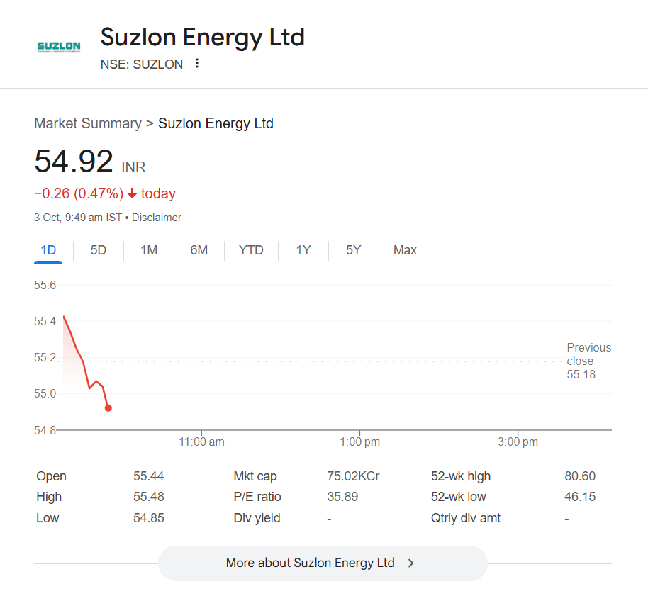 Suzlon Energy share price (NSE: SUZLON) opened October 3, 2025, at INR 54.91, down 0.49% (INR 0.27) amid mixed trading in the renewable energy sector. Investors are keeping a close eye on Suzlon’s performance as government policies supporting clean energy continue to influence the stock. Market watchers note that while long-term growth prospects remain positive, short-term movements reflect broader market volatility and sector-specific challenges. Traders are advised to monitor price trends and upcoming announcements that could impact Suzlon’s share trajectory in the coming sessions. Stocks to Buy or Sell Today, October 03, 2025: United Spirits, RBL Bank, and Maruti Suzuki Among Shares That May Remain in Focus on Friday.