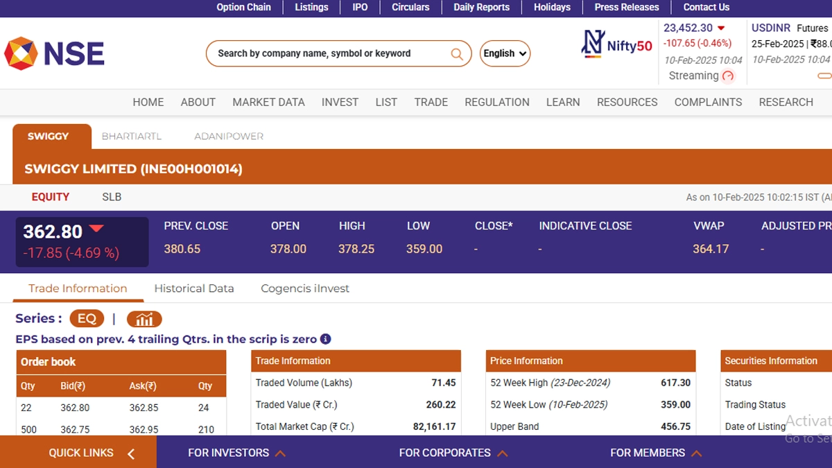 Swiggy Limited (NSE: Swiggy) stocks opened in red today, February 10, in early morning trade. Shares of Swiggy Limited (NSE: Swiggy) were trading at INR 362.80 and fell by INR 17.85 or 4.69 per cent. Notably, Swiggy Limited (NSE: Swiggy) saw its 52-week high and low of INR 617.30 and INR 300 on December 23 last year and today, February 10, respectively. Bharti Airtel Share Price Today, February 10: Stocks of Bharti Airtel Limited Rise by INR 16.70 in Early Trade.