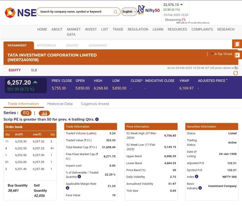 Tata Investment (NSE: TATAINVEST) share price zoomed 8% on Tuesday, February 25, to INR 6,220.75 on the National Stock Exchange (NSE) after Tata Capital approved plans for an initial public offering (IPO). Tata Capital's IPO will include a fresh issue of shares with a face value of INR 10 each, amounting to INR 23 crore. NTPC Green Share Price Today, February 25: Stocks of NTPC Green Energy Limited Rise by 1.34%, Check Latest Price on NSE.