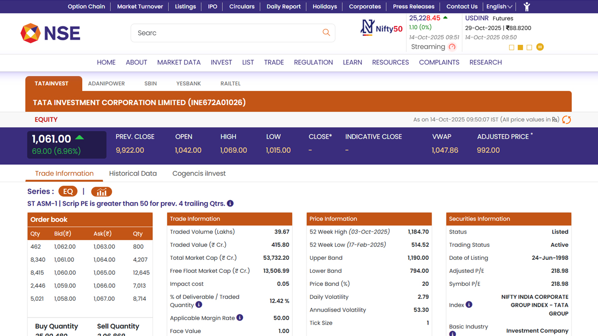 Shares of Tata Investment Corporation Ltd (NSE: TATAINVEST) opened at INR 1,042.00 on Tuesday, October 14, up from the previous close of INR 9,922.00, and surged 6.96% to INR 1,061.00 by 9:55 AM in early trade. The jump comes after the company’s first-ever stock split, adjusting one share of INR 10 face value into ten shares of INR 1 each. The stock touched a 52-week high of INR 1,184.70 on October 3 and has shown strong momentum since the announcement. Today is the record date for the stock split, making existing shareholders eligible for the adjustment. Tata Investment, a Tata Group holding and investment company, saw investor interest rise sharply following the split. Stocks to Buy or Sell Today, October 14, 2025: Lodha Developers, HCLTech and Hero MotoCorp Among Shares That May Remain in Focus on Tuesday.