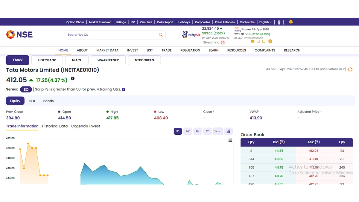 Stocks of Tata Motors Limited (NSE: TMCV) opened in green today, April 1. As soon as the stock market opened for business, shares of Tata Motors Limited (NSE: TMCV) started to trade at INR 421.05 and were growing by INR 17.25 or 4.37 per cent. According to the National Stock Exchange (NSE) website, shares of Tata Motors Limited (NSE: TMCV) saw their 52-week high of INR 509 on February 27 and 52-week low of INR 306.30 on November 14 last year. Stocks To Buy or Sell Today, April 1, 2026: Bharti Airtel, IREDA, Hindustan Copper Among Shares Likely To Remain in Spotlight on Wednesday.