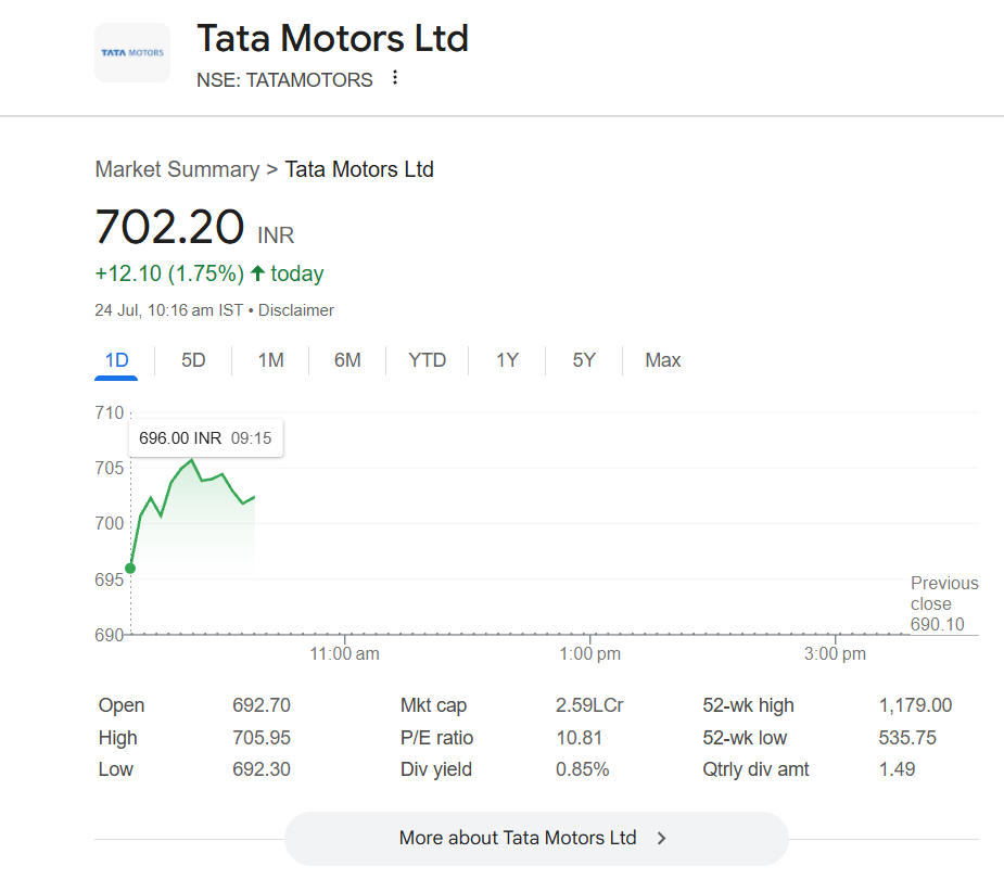 Tata Motors Ltd share price (NSE: TataMotors) gained 1.77% on Thursday, July 24, trading at INR 702.30 on the NSE as of 10:16 AM IST. The stock rose INR 12.20 in intraday action, supported by positive investor sentiment. Analysts attribute the upmove to sustained demand in the passenger and commercial vehicle segments. Tata Motors has remained a key performer in the auto sector, with investors tracking cues from upcoming quarterly results. Stocks To Buy or Sell Today, July 24, 2025: Bajaj Housing, Infosys and Tata Consumer Products Among Shares That May Remain in Spotlight on Thursday.