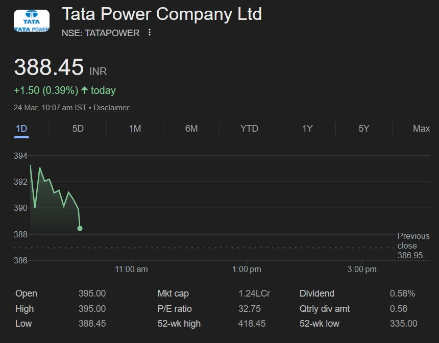 Tata Power Company Ltd share price (NSE: TATAPOWER) edged higher in early trade on March 24, 2026, tracking the broader market’s positive momentum. The stock was trading at INR 388.45 at 10:07 am IST, up INR 1.50 or 0.39 percent. Gains were modest compared to benchmark indices, but the stock remained supported by steady investor interest in the power and renewable energy space. Analysts highlight Tata Power’s expanding clean energy portfolio and stable fundamentals as key positives, while near-term movement may depend on sector trends and overall market direction. Stocks To Buy or Sell Today, March 24, 2026: HDFC Bank, IRFC and IndiGo Among Shares That May Remain in Focus on Tuesday.