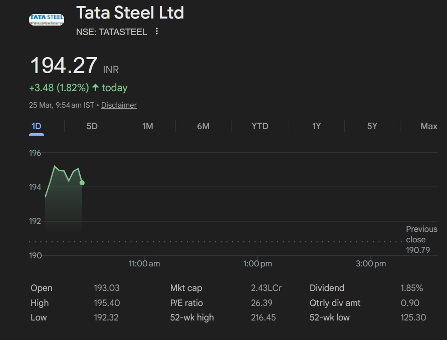 Tata Steel share price (NSE: TATASTEEL) was trading at INR 194.27 on the NSE as of 9:54 AM IST on March 25, 2026. The stock gained INR 3.48, marking an increase of 1.82% in early trade. Buying interest was seen in the opening session, reflecting positive momentum in metal stocks. Investors are closely tracking global commodity trends and demand outlook, which continue to influence price movement. The stock remains active amid broader market cues and sector-specific developments. Stocks To Buy or Sell Today, March 25, 2026: Tata Steel, TVS Motor and HDFC Life Among Shares That May Remain in Spotlight on Wednesday.