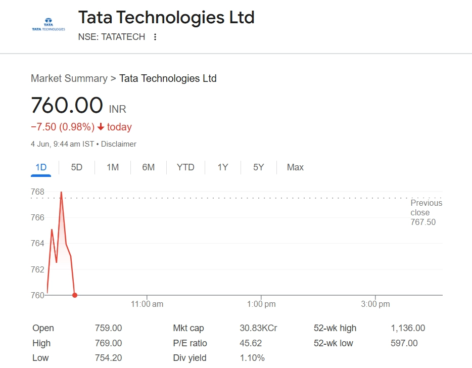Tata Technologies share price (NSE: TataTech) slipped in early trade on Tuesday, June 4, falling 1.01% to INR 759.75 on the NSE as of 9:44 AM IST. The stock declined by ₹7.75 from its previous close, reflecting mild selling pressure amid early market volatility. Investors appear cautious after recent fluctuations in the broader market. Analysts are keeping a close watch on Tata Tech’s performance as it navigates sector-specific and macroeconomic developments. Stocks To Buy or Sell Today, June 04, 2025: Ola Electric Mobility, Tata Technologies and Wipro Among Shares That May Remain in Spotlight on Wednesday.