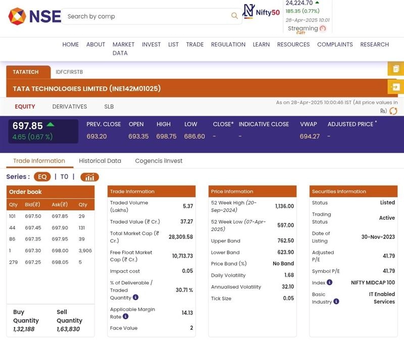 Shares of Tata Technologies (NSE: TATATECH) opened on a positive note on Thursday, April 28, as soon as the stock market opened. According to the National Stock Exchange (NSE) website, stocks of Tata Technologies (NSE: TATATECH) were trading at INR 697.85 and rose by INR 4.65 or 0.67%. Reliance Share Price Today, April 28: Reliance Industries Stock Climbs 2.8% After Reporting Strong Q4FY25 Results.