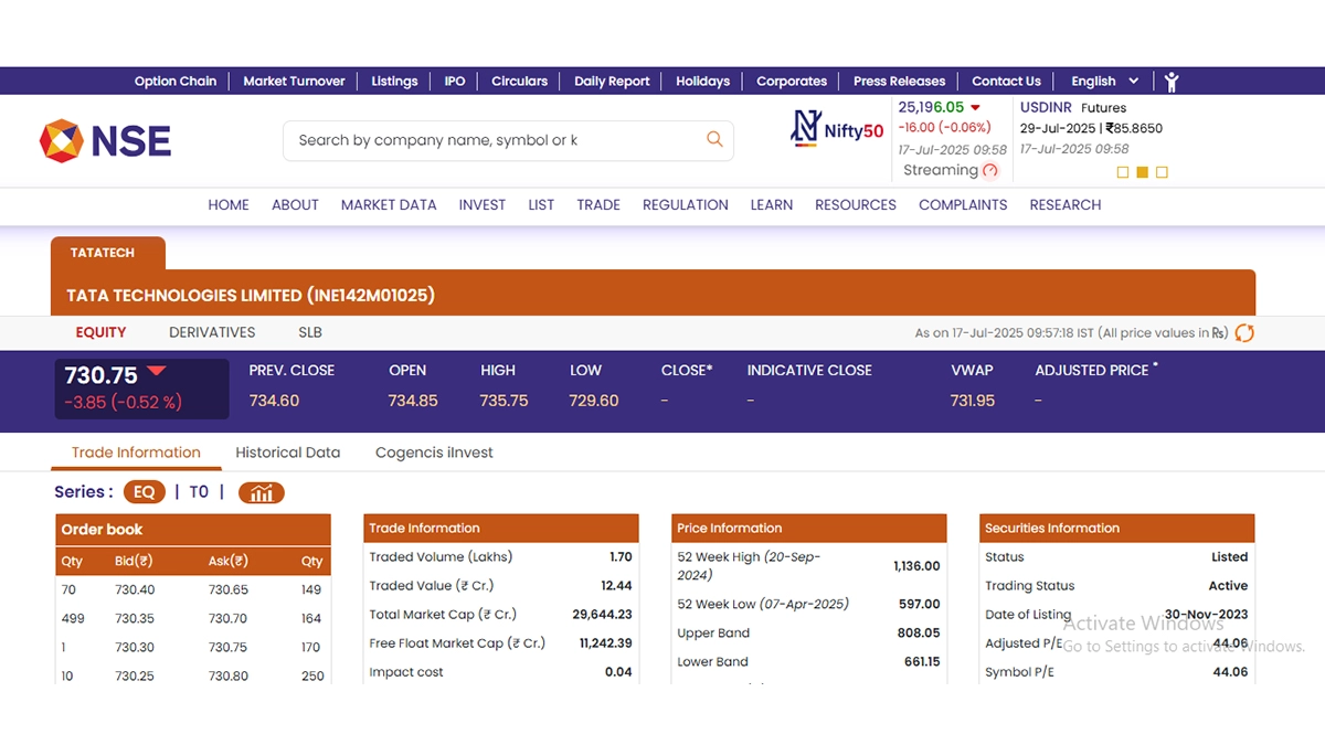Stocks of Tata Technologies Limited (NSE: TATATECH) opened in red today, July 17. According to the National Stock Exchange (NSE) website, shares of Tata Technologies Limited (NSE: TATATECH) were trading at INR 730.75 and fell by INR 3.85 or 0.52 per cent. Notably, shares of Tata Technologies Limited (NSE: TATATECH) saw their 52-week high of INR 1,136 on September 20, 2024 and 52-week low of INR 597 on April 7 this year. Stocks To Buy or Sell Today, July 17, 2025: JSW Energy, Jio Financial, Kotak Mahindra Bank Among Shares That May Remain in Focus on Thursday.