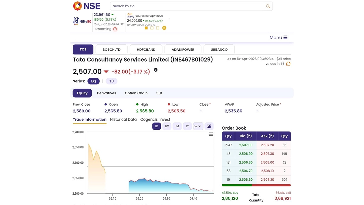 The Tata Consultancy Services (TCS) (NSE: TCS) share price opened in red on Friday, April 10, 2026. The TCS (NSE: TCS) share price was trading at INR 2,507.00, up by INR 82 or 3.17%. This comes after TCS announces its March quarter results yesterday. The firm reported a decline in its total employee base for FY26, even as it continued to invest in talent development and AI-led skills while announcing salary hikes and maintaining hiring momentum in the March quarter. Stocks To Buy or Sell Today, April 10, 2026: Wipro, TCS and Eicher Motors Among Shares That May Remain in Focus on Friday.
