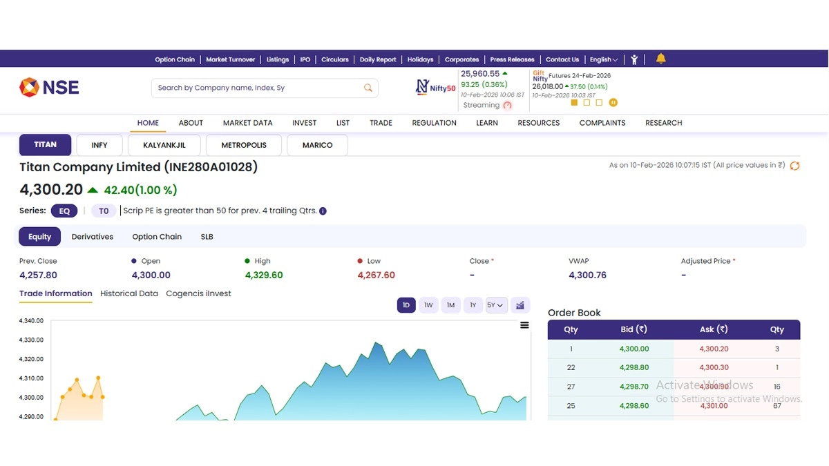 Stocks of Titan Company Limited (NSE: TITAN) opened in green today, February 10. As per the latest stock market trends, shares of Titan Company Limited (NSE: TITAN) were trading at INR 4,300.20 and rose by INR 42.40 or one per cent. Notably, Titan Company Limited (NSE: TITAN) stocks saw their 52-week high of INR 4,329.60 today and 52-week low of INR 2,925 on April 7 last year. Stocks to Buy or Sell Today, February 10, 2026: RailTel, Aurobindo Pharma, and Marico Among Shares That May Remain in Spotlight on Tuesday.
