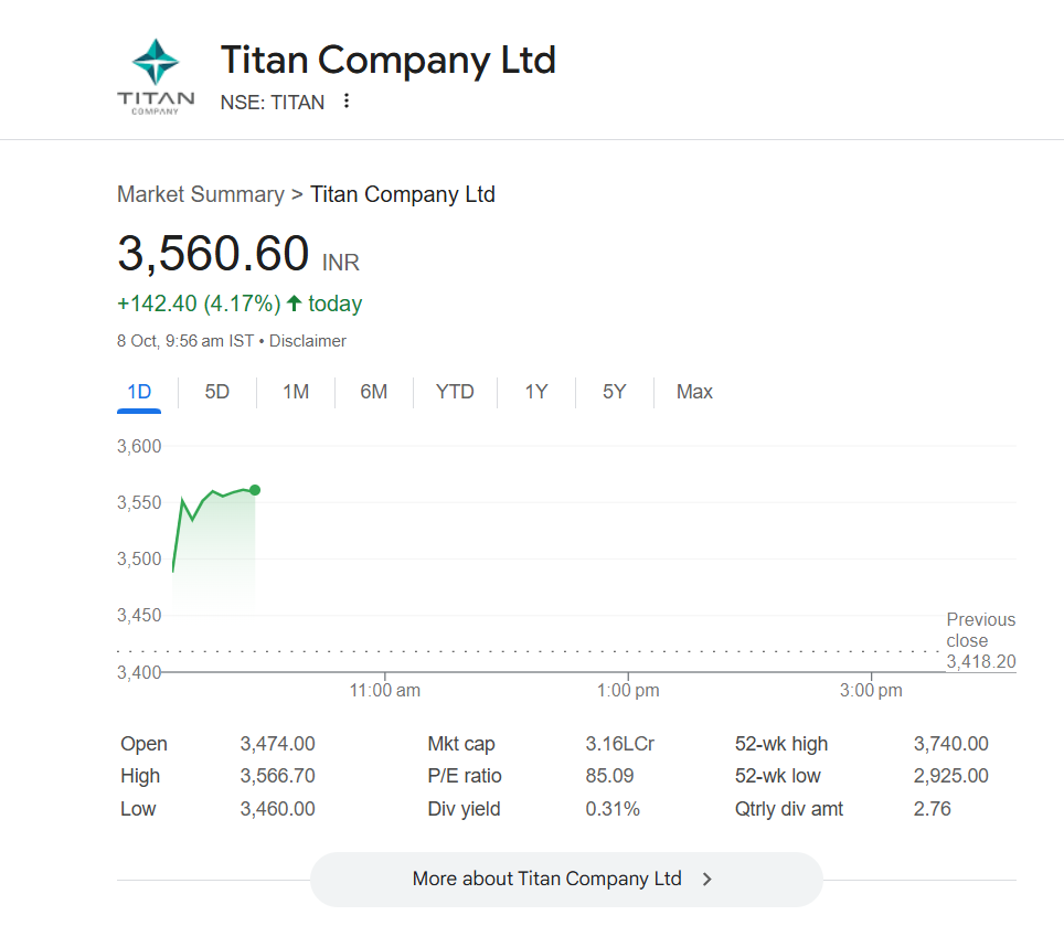 Titan Company Ltd (NSE: TITAN) shares surged 4.17% to INR 3,560.60 on October 8, following the company’s second-quarter business update. Titan’s domestic jewellery business recorded a 19% growth compared to the same quarter last year. The company attributed the growth to rising gold prices, which boosted average ticket sizes, even as the number of buyers saw a slight dip. Titan highlighted that the high base in Q2FY25, driven by customs duty reductions, posed challenges. However, the early onset of the festive season helped offset the high base impact. Analysts say the strong domestic jewellery demand and strategic festive season launches may continue to support revenue momentum. Investors are closely watching Titan’s performance amid fluctuating gold rates and consumer trends in the premium jewellery segment. Stocks To Buy or Sell Today, October 8, 2025: Tata Motors, Titan and Lodha Developers Among Shares That May Remain in Spotlight on Wednesday.