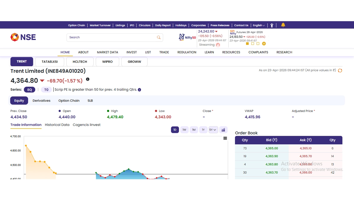 Stocks of Trent Limited (NSE: TRENT) opened in the red today, April 23, as soon as the stock market opened for business. According to the National Stock Exchange (NSE) website, shares of Trent Limited (NSE: TRENT) were trading at INR 4,364.80 and fell by INR 69.70 or 1.57 per cent. It is worth noting that Trent Limited (NSE: TRENT) stocks saw their 52-week high of INR 6,261.00 on June 30 last year and 52-week low of INR 3,275.50 on March 30 this year. This comes after Trent reported 30 per cent growth in Q4 FY26 profit and declared a final dividend of INR 6 per share. Stocks To Buy or Sell Today, April 23, 2026: Tata Communications, Infosys, and BEL Among Shares That May Remain in Focus on Thursday.