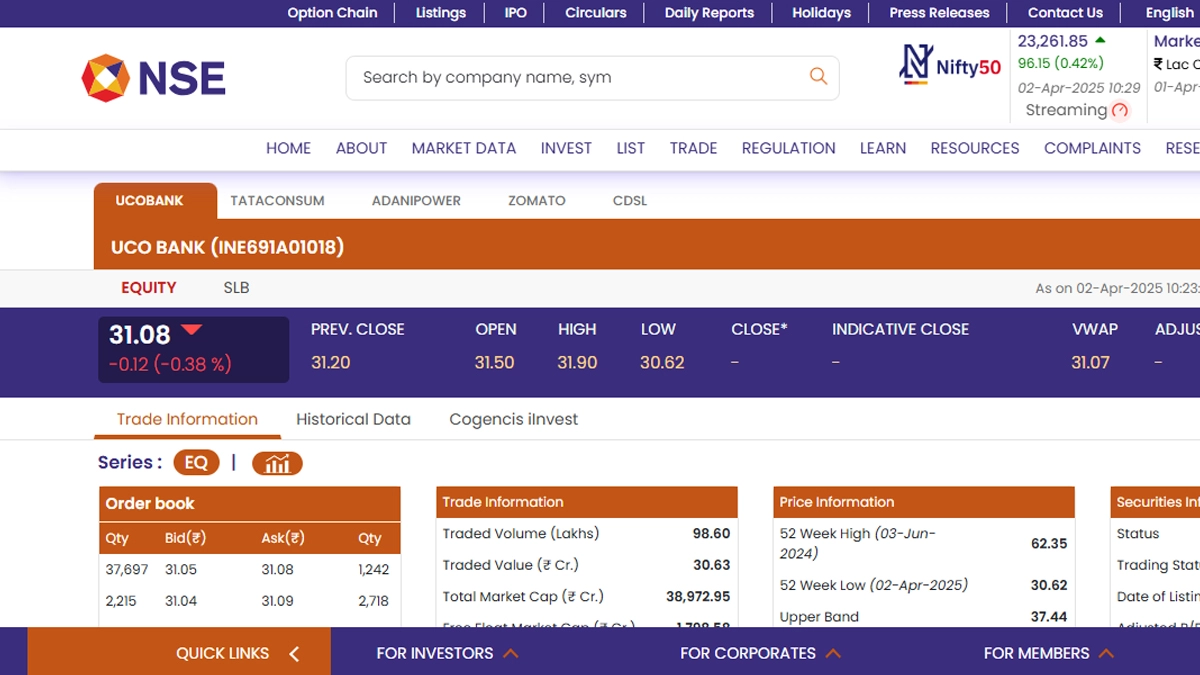 Shares of UCO Bank (NSE: UCOBANK) opened on a negative note today, April 2, as soon as the stock market opened for business. According to the National Stock Exchange (NSE) website, stocks of UCO Bank (NSE: UCOBANK) were trading at INR 31.08 and fell by INR 0.12 or 0.38 per cent. Notably, UCO Bank (NSE: UCOBANK) saw its 52-week high of INR 62.35 on June 3 last year. Tata Consumer Share Price Today, April 2: Stocks of Tata Consumer Products Limited Rise by 7.13% in Early Trade, Check Latest Price on NSE.