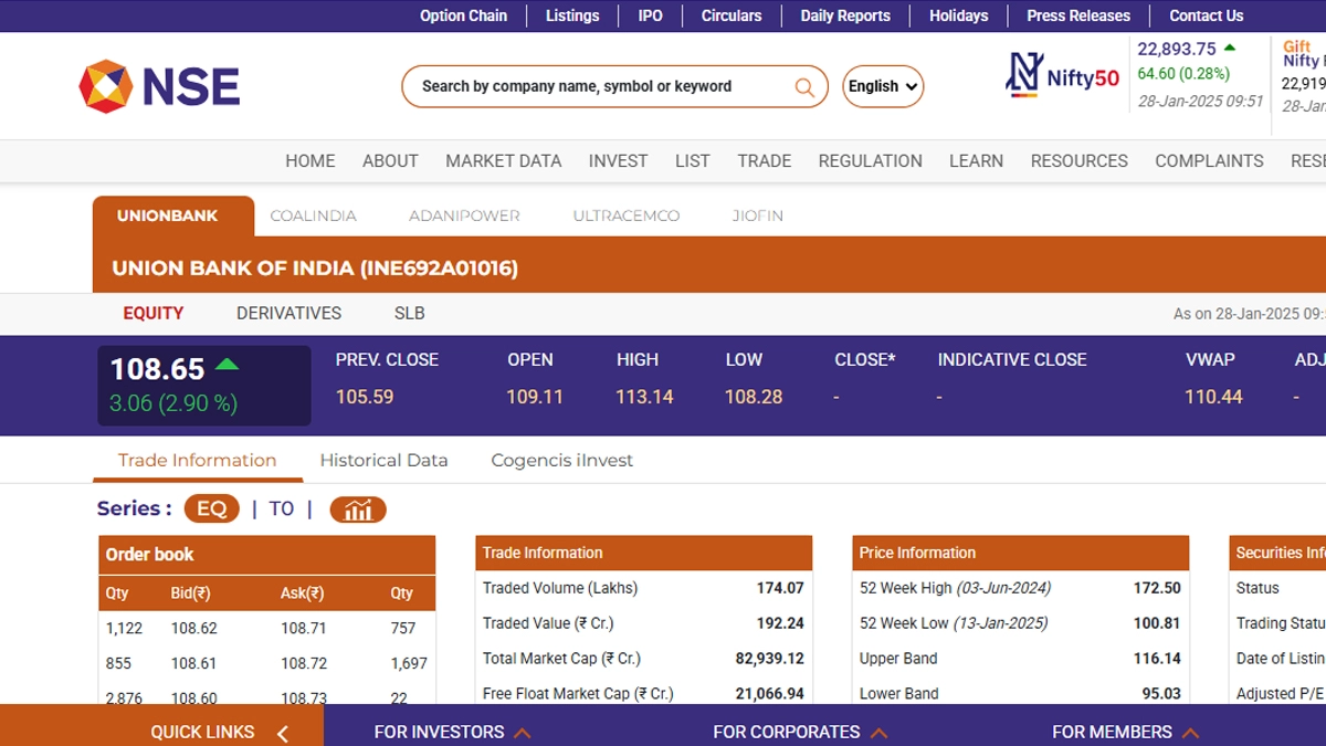 Union Bank of India (NSE: Union Bank) shares opened in green today, January 28, in early morning trade. Stocks of Union Bank of India (NSE: Union Bank) were trading at INR 108.65 and saw an increase of INR 3.06 or 2.90 per cent in early morning trade today. Union Bank of India (NSE: Union Bank) shares saw their 52-week high of INR 172.50 on June 3, 2024, and a 52-week low of INR 100.81 on January 25 this year. Coal India Share Price Today, January 28: Stocks of Coal India Limited Fall in Early Trade, Check Latest Price on NSE.