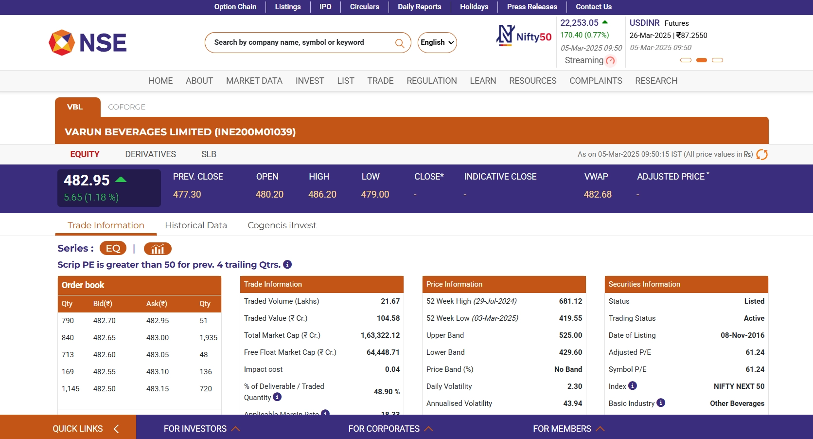 As of 9:50 AM IST on March 5, 2025, Varun Beverages share price (NSE: VBL) is trading at INR 482.45 on the National Stock Exchange (NSE), reflecting a 1.08% increase from the previous close of INR 477.30. On March 4, 2025, the stock closed at INR 477.30, up 4.45% from the prior day’s close of INR 456.95. Over the past month, VBL’s share price has declined by 18.65% on the Bombay Stock Exchange (BSE). Investors are advised to monitor market trends and company developments when considering investment decisions. Stocks To Buy or Sell Today, March 5, 2025: Adani Wilmar, Ola Electric Mobility, RVNL Among Shares That May Remain in Focus on Wednesday.