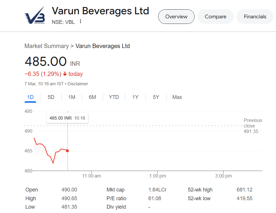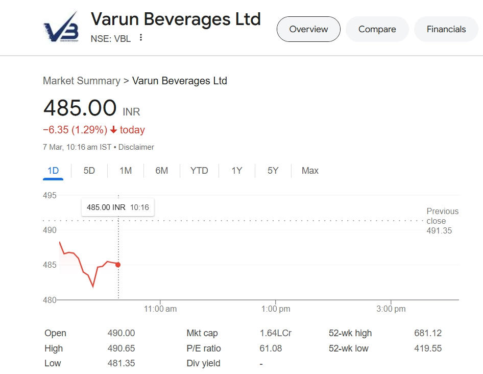 As of 10:16 AM IST on March 7, 2025, Varun Beverages share price (NSE: VBL) is trading at INR 485.00 on the National Stock Exchange (NSE), reflecting a decrease of INR 6.35 (1.29%) from the previous close. The stock has experienced fluctuations over the past week, with a notable increase of 3.22% on March 6, 2025, closing at INR 491.35, up from INR 476.00 on March 5. Investors are advised to monitor these movements closely, considering both short-term volatility and long-term performance. Stocks To Buy or Sell Today, March 7, 2025: RVNL, NMDC, Bajaj Finserv Among Shares That May Remain in Focus on Friday.