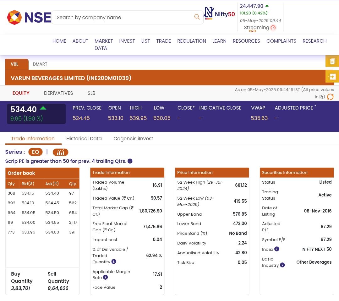 Shares of Varun Beverages Limited (NSE: VBL) saw a sharp rally in early Monday trade, rising by 1.90% to INR 534.40 on the NSE. On Wednesday, May 7, shares of Varun Beverages (NSE: VBL) will turn ex-date for an interim dividend of 25% or INR 0.50 equity per share. Dmart Share Price Today, May 05: Stocks Avenue Supermarts Limited Down by 2.83%, Check Latest Price on NSE and BSE.