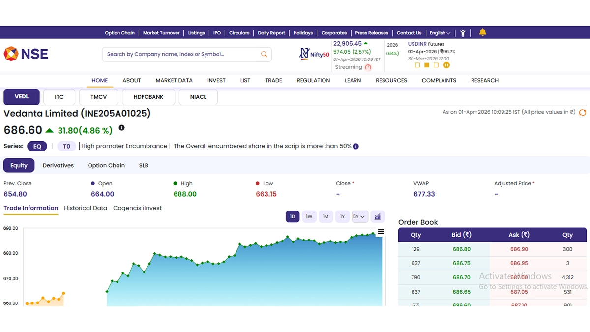Shares of Vedanta Limited (NSE: VEDL) opened on a positive note today, April 1, as soon as the stock market opened for business. As per the latest stock market developments, stocks of Vedanta Limited (NSE: VEDL) were trading at INR 686.50 and rose by INR 31.80 or 4.86 per cent. According to the National Stock Exchange (NSE) website, shares of Vedanta Limited (NSE: VEDL) saw their 52-week high and low of INR 769.80 and INR 363 on January 29 this year and April 7 last year. Tata Motors Share Price Today, April 1, 2026: Stocks of Tata Motors Open in Green in Early Trade, Check Latest Price on NSE.