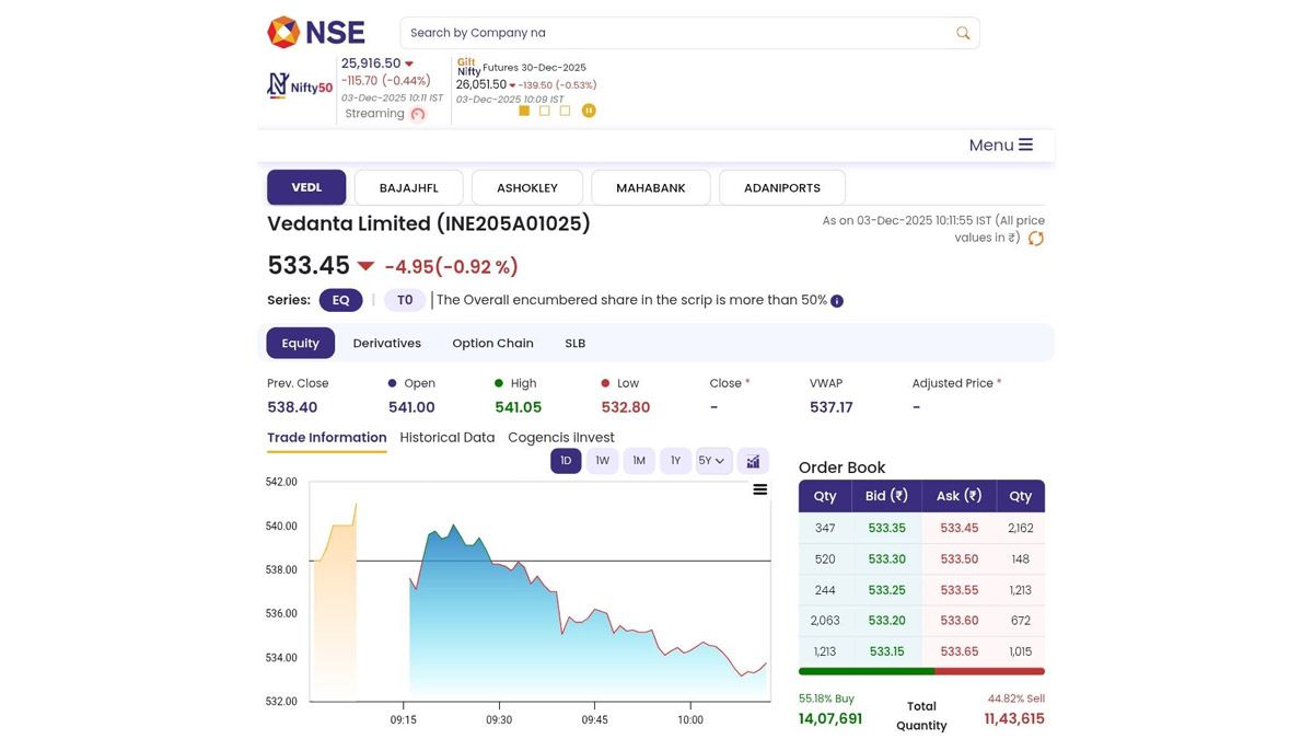 The stocks of Vedanta Limited (NSE: VEDL) opened in the red on Wednesday, December 3. The stocks of Vedanta were trading at INR 533.45 on December 3. Vedanta has been tightening its cost structure, particularly in the aluminium division. The company recently commissioned a 1.5 mtpa alumina refinery at Lanjigarh, taking total capacity to 5 mtpa. Stocks to Buy or Sell Today, December 3, 2025: Canara Bank, IRFC and Motilal Oswal Among Shares That May Remain in Focus on Wednesday.