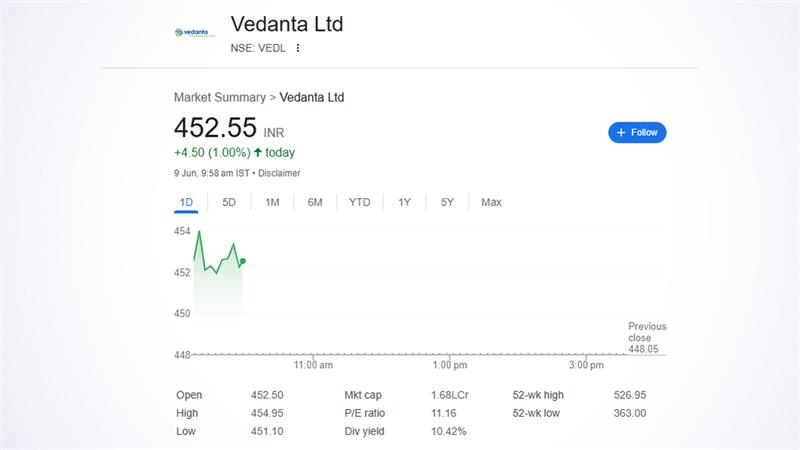 Shares of Vedanta Ltd (NSE: VEDL) rose by 0.93% in early trading on Sunday, reaching INR 452.20 as of 10:02 AM IST. The stock opened at INR 452.50 and touched an intraday high of INR 454.95, with a low of INR 451.10. The company’s market capitalisation currently stands at approximately INR 1.68 lakh crore, and it trades at a price-to-earnings (P/E) ratio of 11.16. Vedanta continues to appeal to investors with a strong dividend yield of 10.42%.