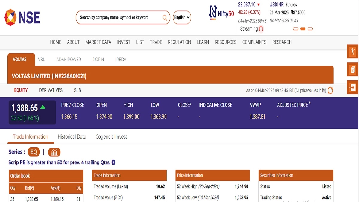 Stocks of Voltas Limited (NSE: Voltas) opened on a positive note today, March 4. According to the latest trading updates, shares of Voltas Limited (NSE: Voltas) were trading at INR 1,388.65 and witnessed a rise of INR 22.50 or 1.65 per cent. Voltas Limited (NSE: Voltas) saw its 52-week high of INR 1,944.90 on September 20 last year. Varun Beverages Share Price Today, March 4: Stocks of Varun Beverages Limited Rise by 1.13% in Early Trade, Check Latest Price on NSE.