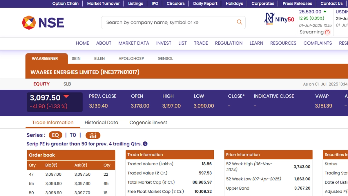 Waaree Energies Limited (NSE: WAAREEENER) stocks opened on a negative note today, July 1. Shares of Waaree Energies Limited (NSE: WAAREEENER) were trading at INR 3,097.50, according to the National Stock Exchange (NSE) website. It is also learnt that stocks of Waaree Energies Limited (NSE: WAAREEENER) fell by INR 41.90 or 1.33 per cent. It is worth noting that Waaree Energies Limited (NSE: WAAREEENER) shares saw their 52-week high of INR 3,743 on November 6, 2024. Gensol Engineering Share Price Today, July 1: Stocks of Gensol Engineering Limited Rise by 4.99% in Early Trade, Check Latest Price on NSE.